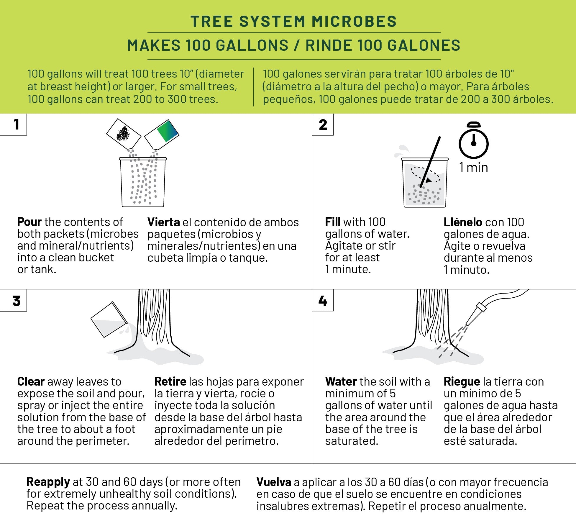 We recommend treating trees with a simple basal drench or soil injection, for professionals. Reapply Day 30 and Day 60. Repeat this three-month protocol annually.
