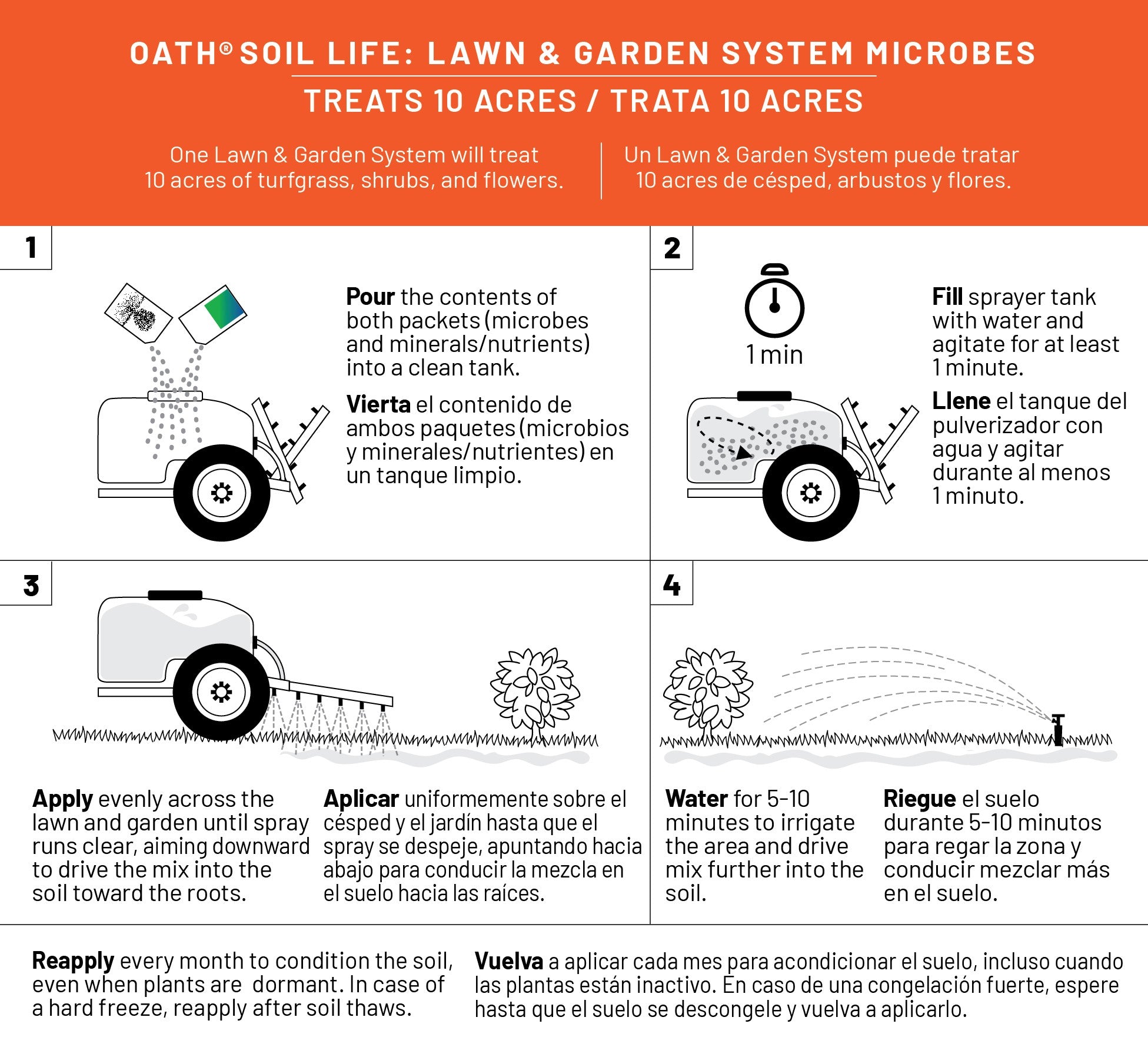 We recommend broadcast spraying across lawn and garden soil, aiming downward to drive the mix past the surface down into the roots. Reapply monthly or bi-monthly throughout the growing season. Reach out to our agronomists for more information on application instructions and sizing your treatment plot: Care@OathSoilLife.com