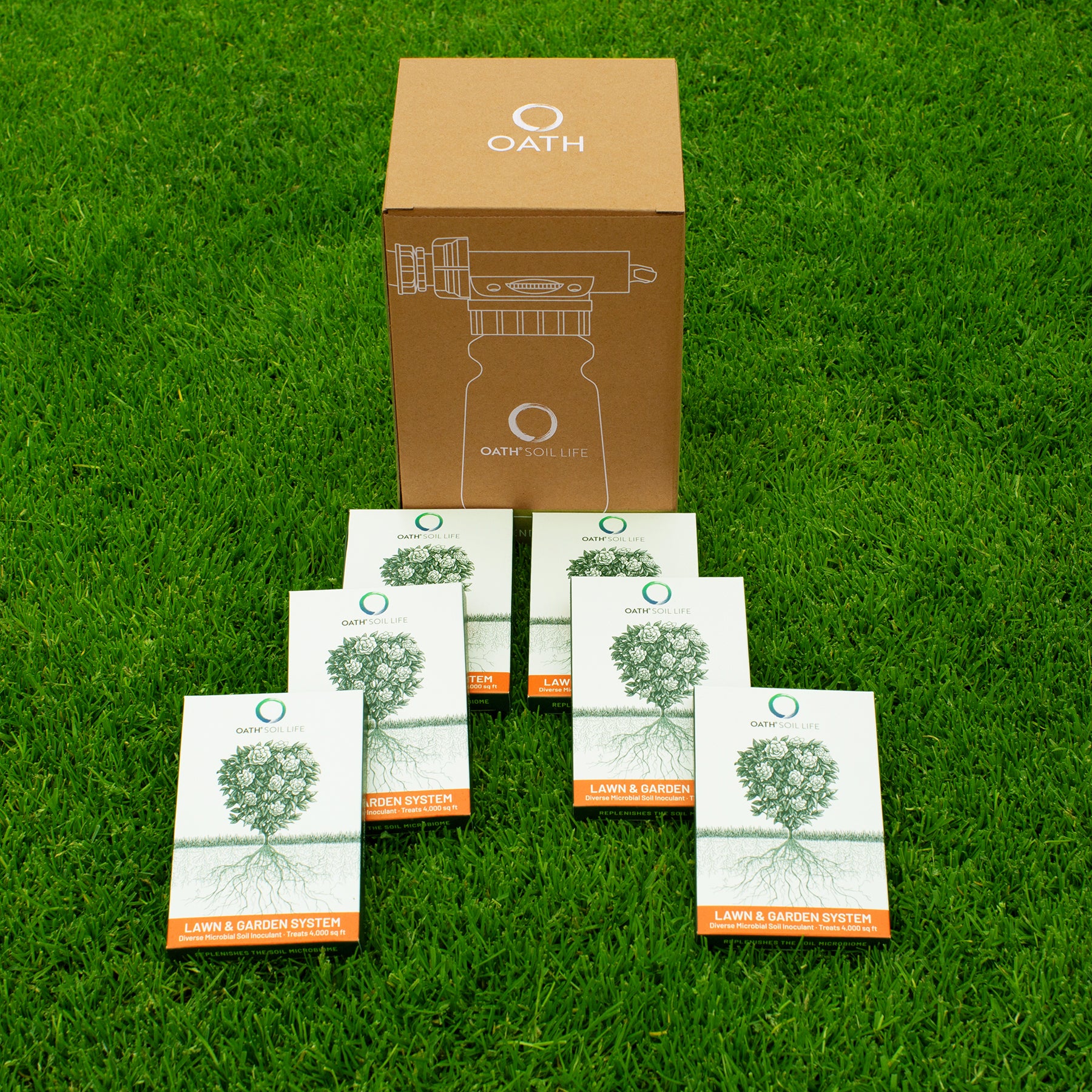 We recommend broadcast spraying across lawn and garden soil, aiming downward to drive the mix past the surface down into the roots. Reapply monthly or bi-monthly throughout the growing season. Reach out to our agronomists for more information on application instructions and sizing your treatment plot: Care@OathSoilLife.com