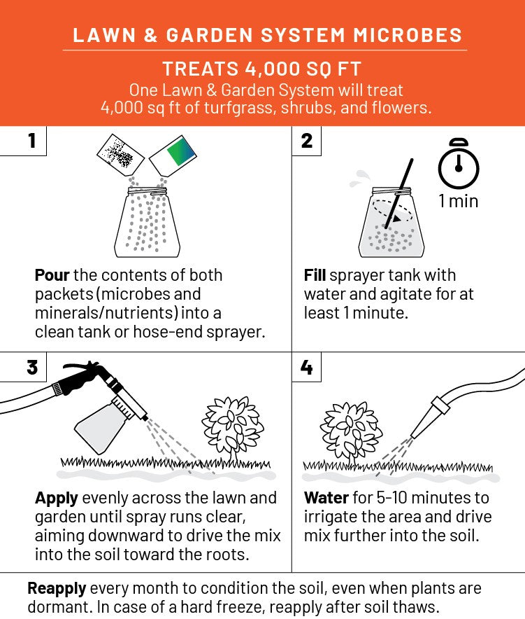 We recommend broadcast spraying across lawn and garden soil, aiming downward to drive the mix past the surface down into the roots. Reapply monthly or bi-monthly throughout the growing season. Reach out to our agronomists for more information on application instructions and sizing your treatment plot: Care@OathSoilLife.com