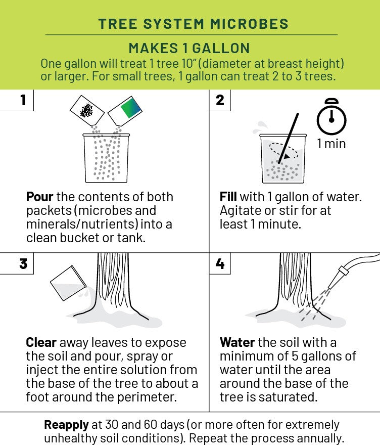 We recommend treating trees with a simple basal drench or soil injection, for professionals. Reapply Day 30 and Day 60. Repeat this three-month protocol annually.